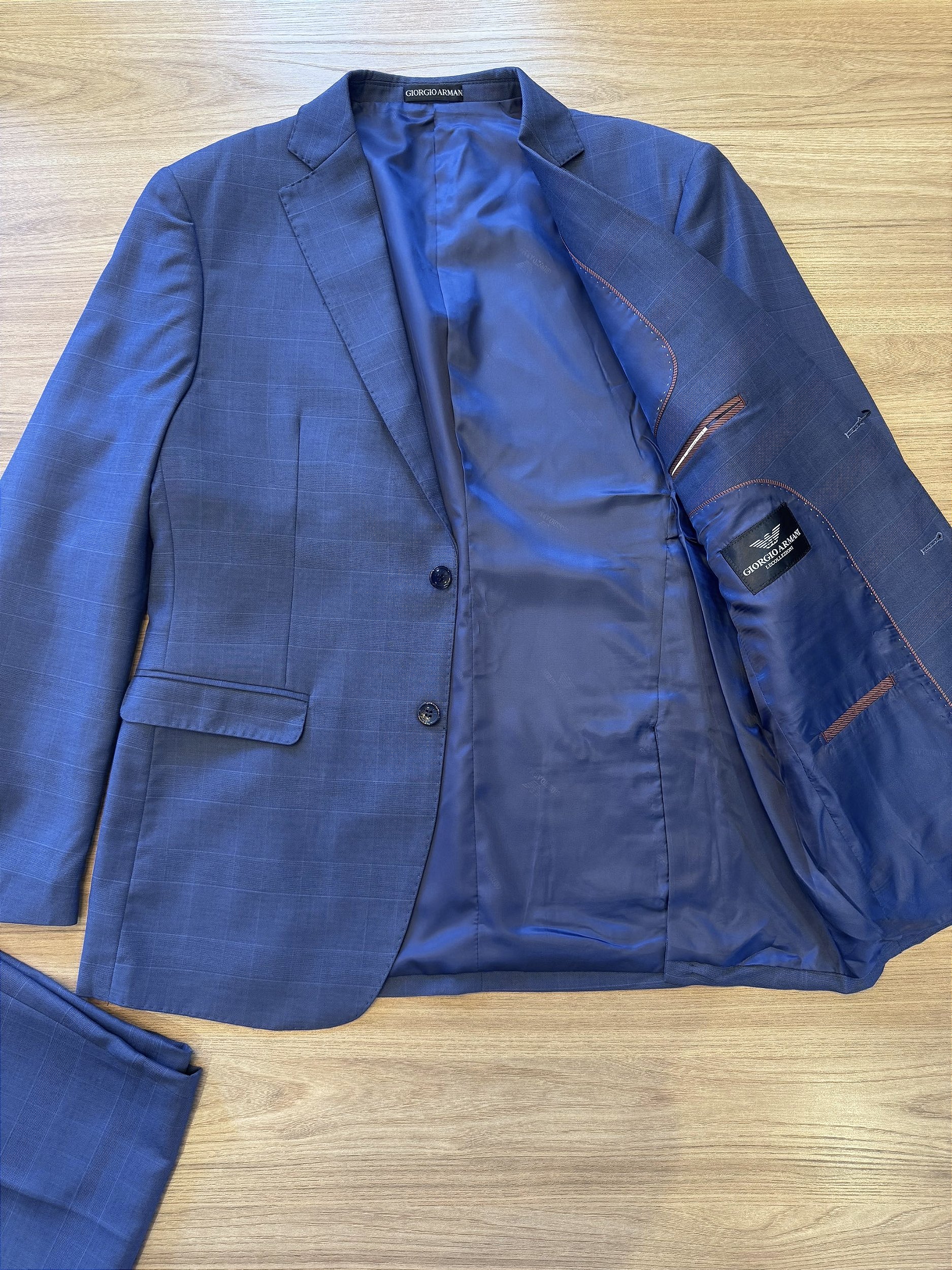 A compra inclui o conjunto completo do terno: paletó e calça na padronagem azul xadrez.